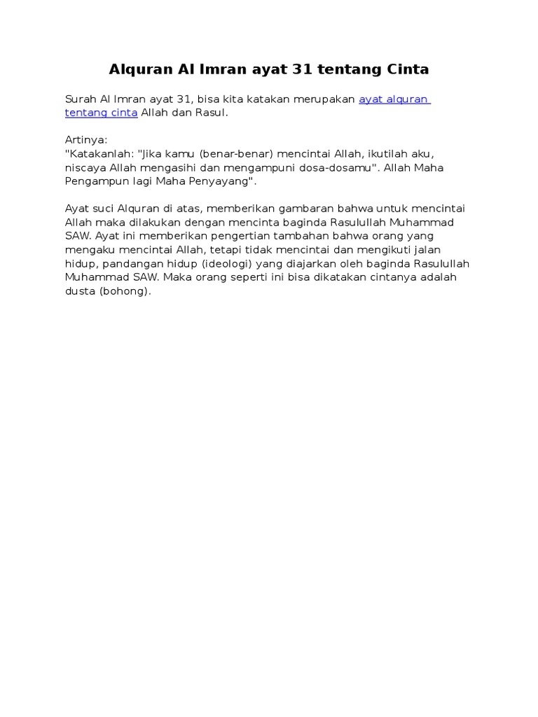 Alquran Al Imran Ayat 31 Tentang Cinta from imgv2-2-f.scribdassets.com We hope to make it easy for everyone to read, study, and learn the noble quran. Surah al imran ayat 31 with english translation. If you love allah, then follow me; We hope to make it easy for everyone to read, study, and learn the noble quran. Read and learn surah imran 3:31 in english translation to get allah's blessings. Surah al imran ayat 31 for love marriage is for those who are willing to create love in someone's heart to marry their true love. Verse no 31 of 200 arabic text, urdu and english translation from kanzul iman next verse 'o beloved! Surah ali 'imran(آل عمران) 3:1 alif, lām, meem.1.